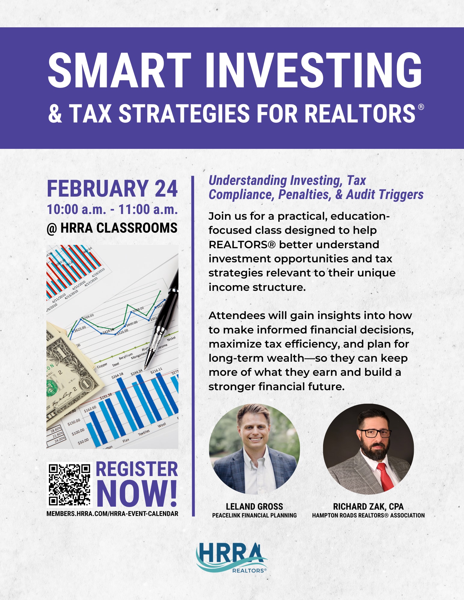 Join us for a practical, education-focused class designed to help REALTORS® better understand investment opportunities and tax strategies relevant to their unique income structure. Attendees will gain insights into how to make informed financial decisions, maximize tax efficiency, and plan for long-term wealth—so they can keep more of what they earn and build a stronger financial future.