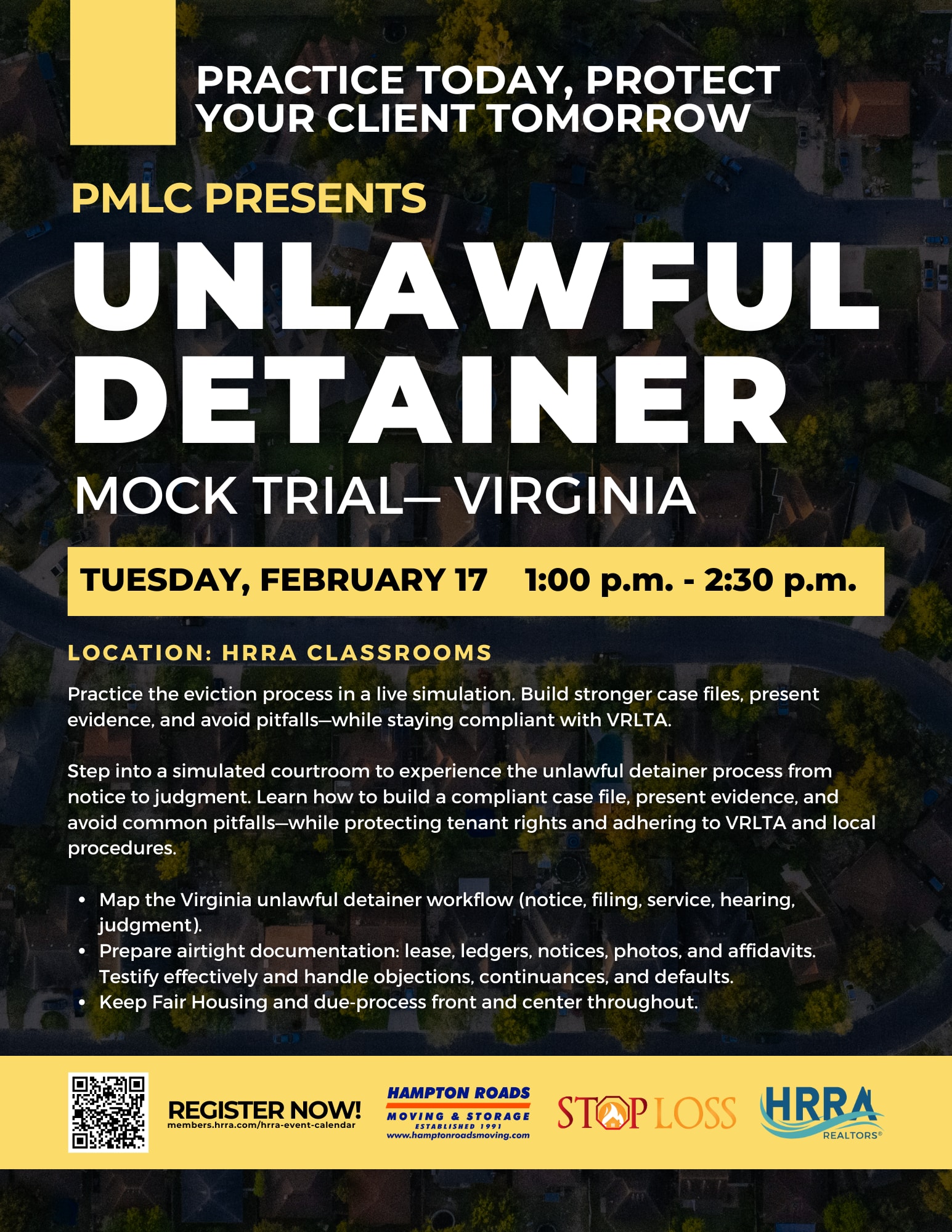 Practice the eviction process in a live simulation. Build stronger case files, present evidence, and avoid pitfalls—while staying compliant with VRLTA. Step into a simulated courtroom to experience the unlawful detainer process from notice to judgment. Learn how to build a compliant case file, present evidence, and avoid common pitfalls—while protecting tenant rights and adhering to VRLTA and local procedures. Map the Virginia unlawful detainer workflow (notice, filing, service, hearing, judgment). Prepare airtight documentation: lease, ledgers, notices, photos, and affidavits. Testify effectively and handle objections, continuances, and defaults. Keep Fair Housing and due‑process front and center throughout.