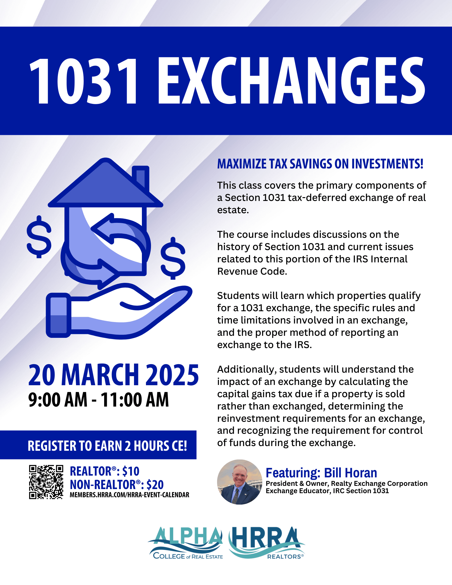 This class covers the primary components of a Section 1031 tax-deferred exchange of real estate. The course includes discussions on the history of Section 1031 and current issues related to this portion of the IRS Internal Revenue Code. Students will learn which properties qualify for a 1031 exchange, the specific rules and time limitations involved in an exchange, and the proper method of reporting an exchange to the IRS. Additionally, students will understand the impact of an exchange by calculating the capital gains tax due if a property is sold rather than exchanged, determining the reinvestment requirements for an exchange, and recognizing the requirement for control of funds during the exchange.