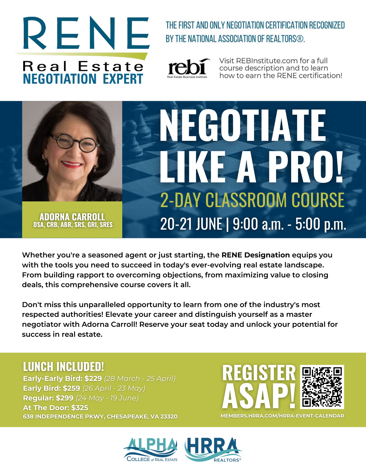 Don't miss this amazing 2-day course from one of the industry's most respected authorities! Elevate your career and distinguish yourself as a master negotiator with Adorna Carroll! Reserve your seat today and unlock your potential for success in real estate.