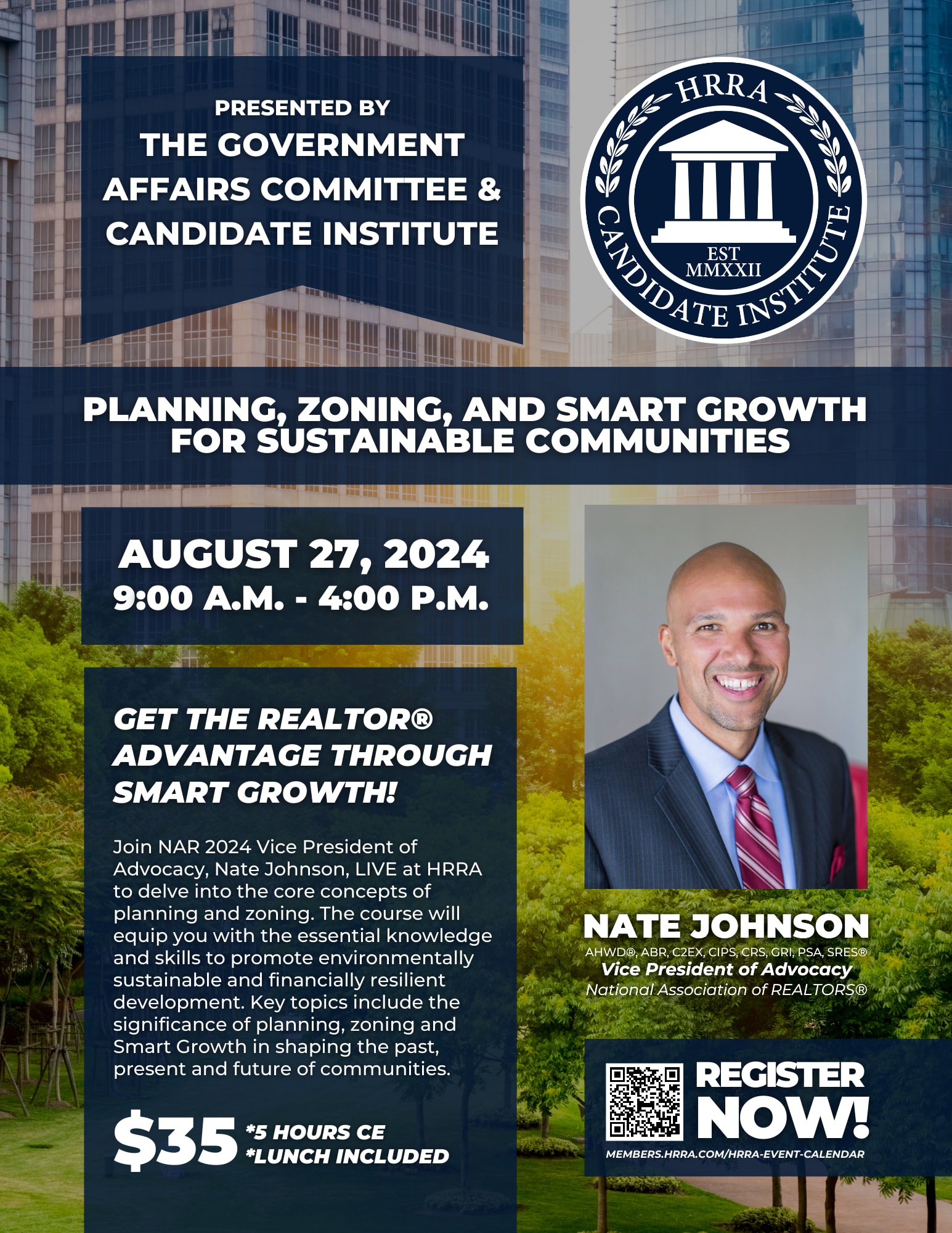Join NAR 2024 Vice President of Advocacy, Nate Johnson, LIVE at HRRA to delve into the core concepts of planning and zoning. The course will equip you with the essential knowledge and skills to promote environmentally sustainable and financially resilient development. Key topics include the significance of planning, zoning and Smart Growth in shaping the past, present and future of communities.