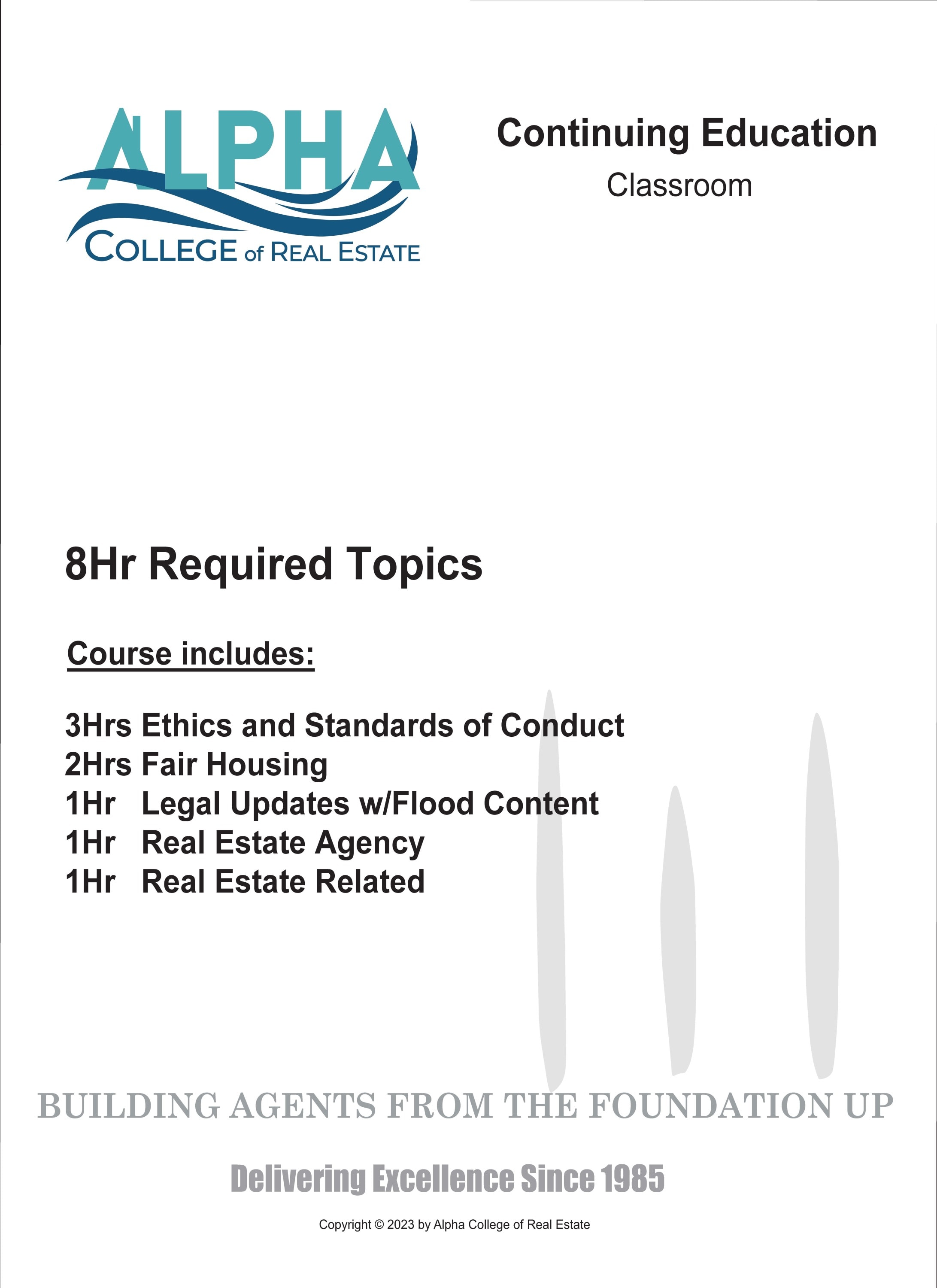 All the topics included in the course, once completed by the agent, will provide the agent with a clean understanding of the Virginia Laws and regulations that govern the agent's action regarding these topics. Once a licensee understands these laws and regulations, they will better service their clients, customers, and the public. The current case studies, questions, and answers, give examples of how to apply what is learned. This course is authorized for 8 hours of CE Credit as follows: 3HR Ethics and Standards of Conduct, 2HR Fair Housing, 1HR Legal Updates w/Flood, 1HR Real Estate Agency, 1HR Related Content