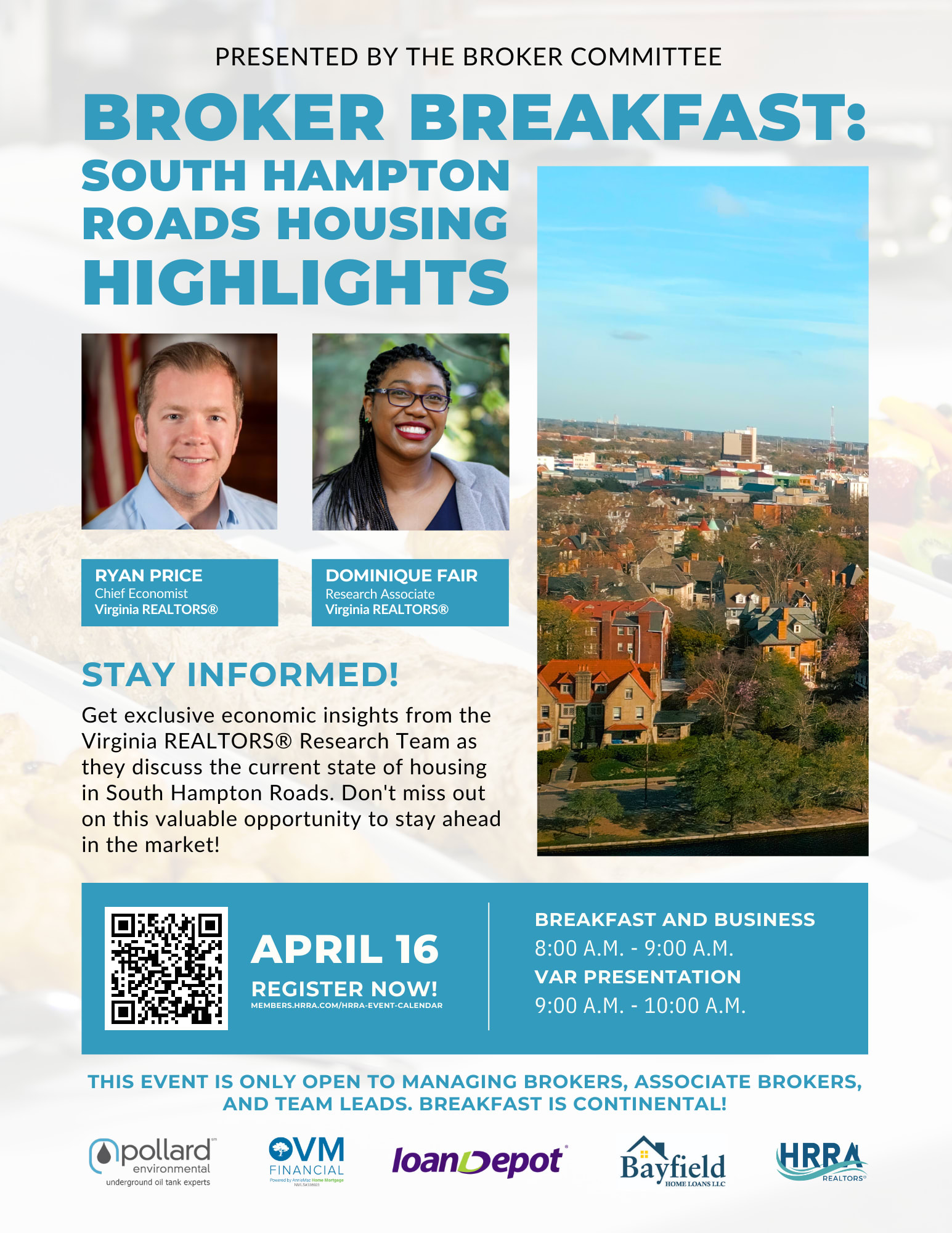 Get exclusive economic insights from the Virginia Realtors Research Team as they discuss the current state of housing in South Hampton Roads. Don't miss out on this valuable opportunity to stay ahead in the market!